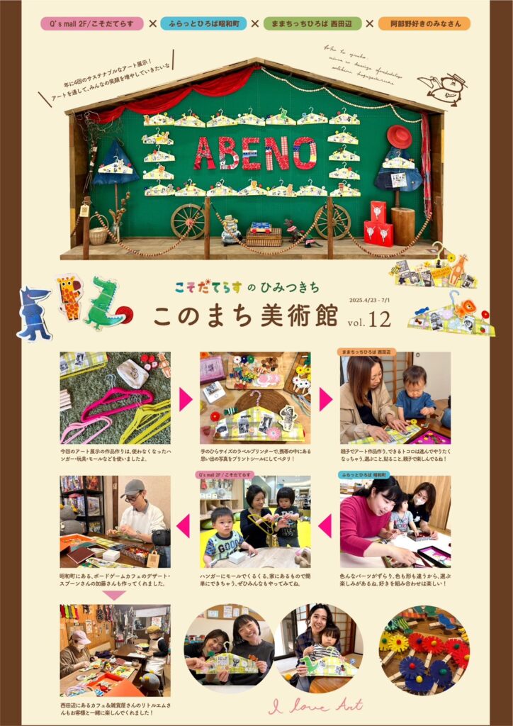 阿倍野区は、工芸高校やデザイン専門学校があり街にはアーティストが多いイメージがあります。「このまち美術館」は、あべのキューズモール3階のフードコートでの打合せから始まりました。打合せでは、まだ名前の無いこの取り組みについて、街の中でのアートを編集し、環境とアート、子育てとアート、学生とアートなどアートと様々な対象を掛け合わせ、未来を紡いでいきたいと、熱く語るアートディレクターの一般社団法人comodotoままちっちのO氏の話しをお聞きしました。