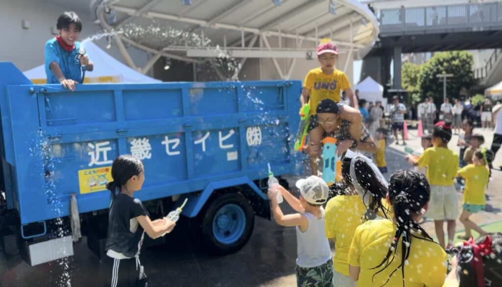 真夏の暑い中でも屋外で遊べるよう大量の氷で冷やした水を用意し、使用済みペットボトルを洗浄し、水鉄砲を作りイベント参加者同士で水の掛け合いっこをしたり水を使ったパレードをするという企画を実施していただきました。また、不用品として集まるまだ使えるおもちゃやこども衣類などを展示し、来場者がご持参される不用品と交換ができる「とっかえっこブース」の設置もしてくださいました。そして、地元団体・企業の方々に飲食やゲーム、ワークショップなどのブースも出店していただきました。